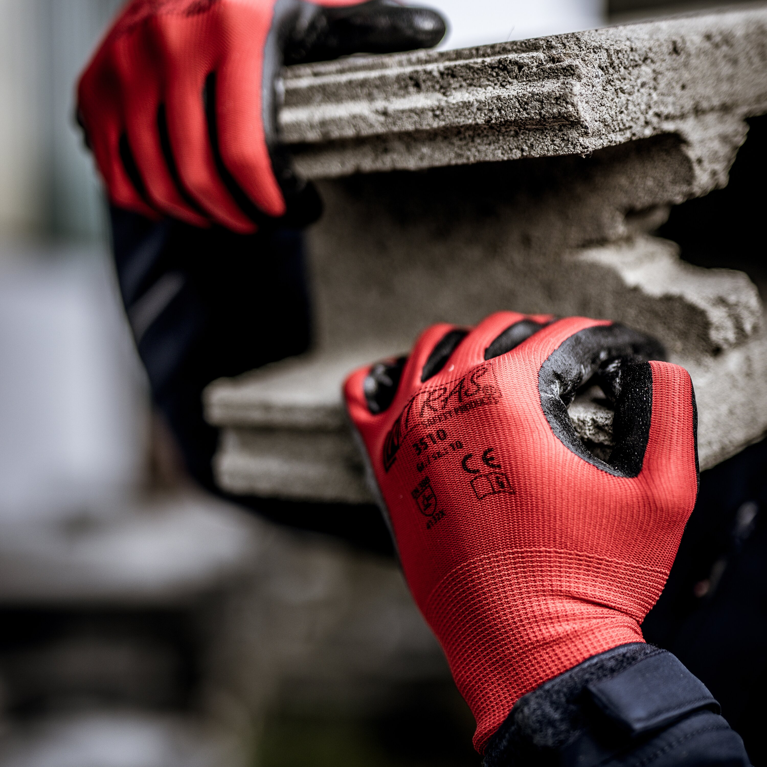 NITRAS Nylonhandschuhe, rot, Nitrilschaum-Beschichtung, schwarz (Farbcode: 6010), teilbeschichtet auf Innenhand und Fingerkuppen, Strickbund