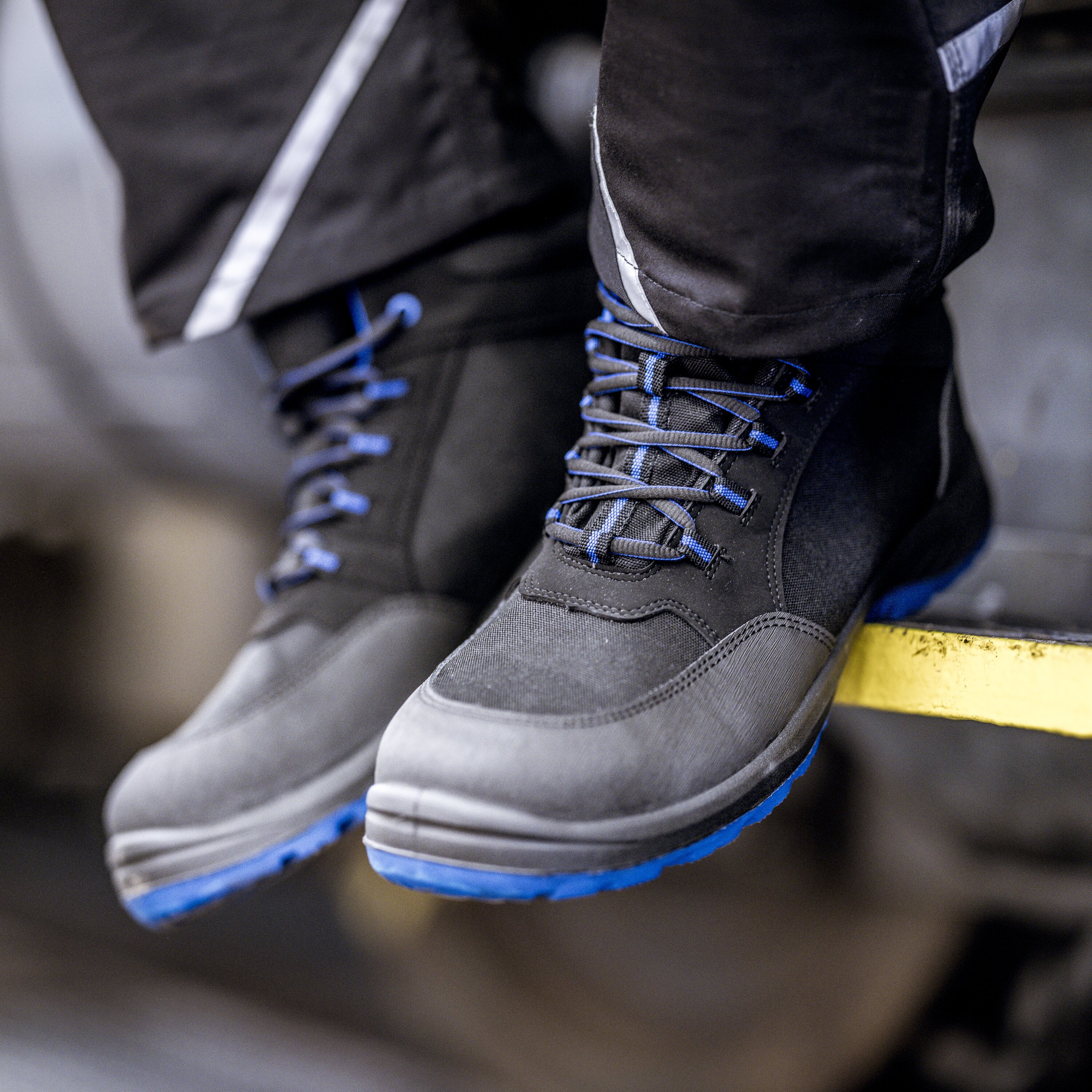 NITRAS SOLID STEP MID, Sicherheitsstiefel, halbhoch, S3S CI FO SR, strapazierfähiges Textil, schwarz, widerstandsfähige PU / PU-Laufsohle, schwarz / blau (Farbcode: 1022), Zehenkappe aus Fiberglas, durchstichhemmende Zwischensohle aus Textil, metallfrei, hochwertige COMFORT STEP Einlegesohle, ergonomisch geformt, modernes Design, bestmögliche Rutschhemmung (SR), Weite 11, gut gepolsterter Schaft für bestmöglichen Halt und Komfort, Fersenfutter für ein einfaches An- und Ausziehen sowie Fersenverstärkung aus robuster Mikrofaser, zusätzliche Überkappe, DGUV Regel 112-191-zertifiziert, ESD-fähig