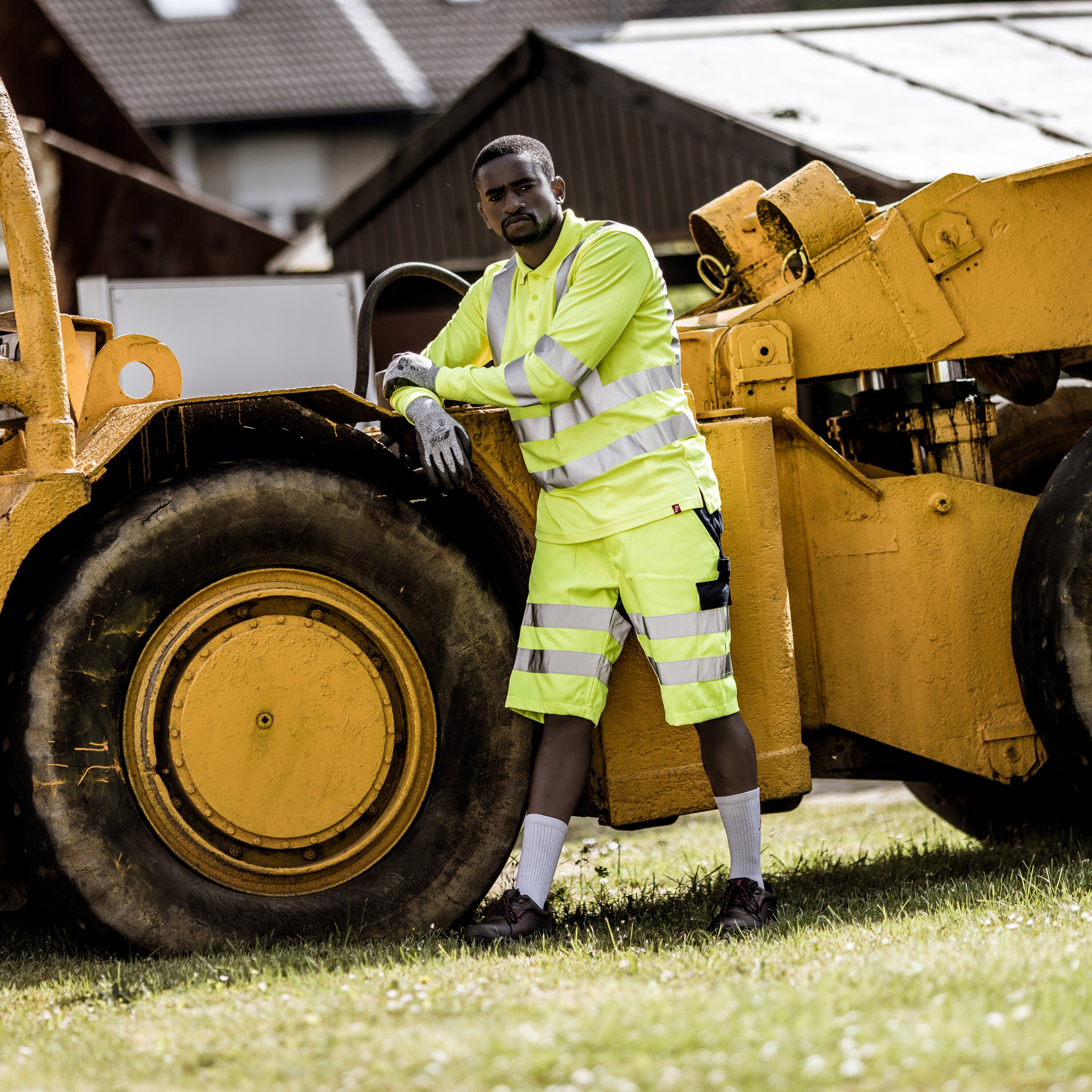 NITRAS MOTION TEX VIZ, kurze Warnschutz-Arbeitshose, 280 g/qm, atmungsaktives und leichtes Material, hoher Tragekomfort, dehnbarer Bund, Verstärkungen an rückseitiger Gürtelschlaufe und Gesäßtaschen sowie Beintaschen, umlaufende Reflexstreifen und Reflexbiesen an den Seitentaschen für besonders gute Sichtbarkeit, praktische und funktionale Details: Schenkeltasche mit Patte, Zollstocktasche mit aufgesetzter Tasche, Hammerschlaufe, Regular Fit.